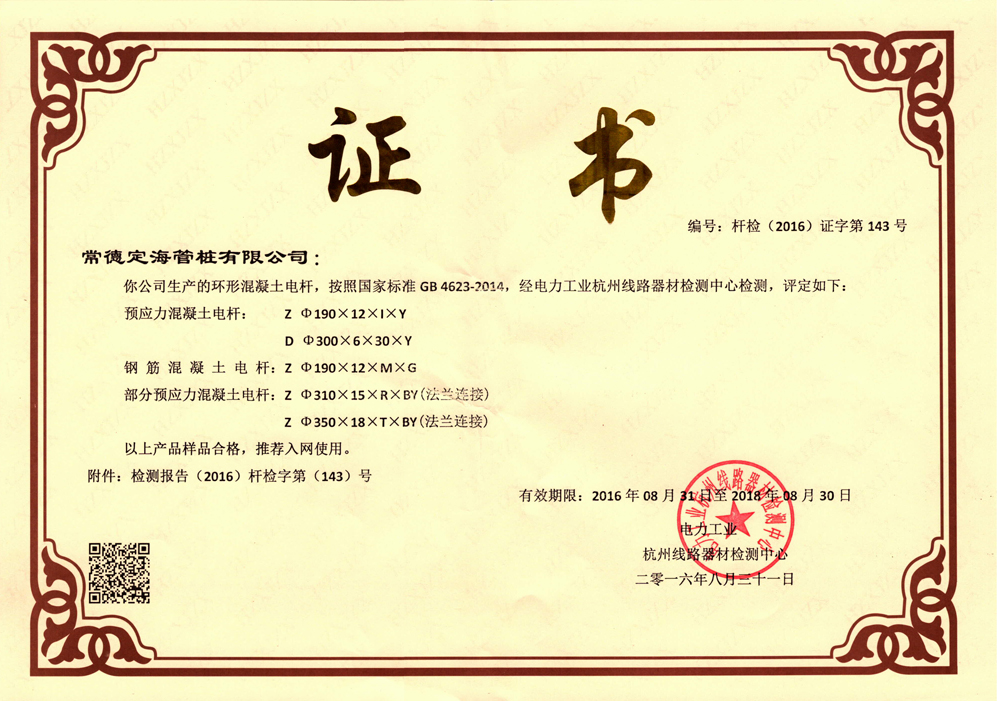 由本公司根據(jù)國(guó)標(biāo)GB4623-2014《環(huán)形混凝土電桿》研發(fā)生產(chǎn)并申請(qǐng)專利的系列預(yù)應(yīng)力混凝土等徑高壓電桿、系列部分預(yù)應(yīng)力混凝土大彎矩電桿、系列鋼筋混凝土電桿。經(jīng)國(guó)家電力線路器材檢測(cè)機(jī)構(gòu)具備簽發(fā)入網(wǎng)許可證書(shū)的單位,電力工業(yè)杭州線路器材檢測(cè)中心實(shí)地抽樣檢測(cè),各項(xiàng)檢測(cè)指標(biāo)均優(yōu)于國(guó)家標(biāo)準(zhǔn),簽發(fā)了桿檢(2016)證字第143號(hào)推薦入網(wǎng)使用證書(shū)。為公司的產(chǎn)業(yè)鏈延伸以及電桿項(xiàng)目投標(biāo)提供了有力的技術(shù)支撐。